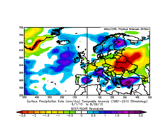 Dies ist eingetroffen, wie man am obigen Plot gut erkennen kann. Vom Azorenhoch bildeten sich immer wieder Keile, die für das entsprechend warm-heiße und trockene Wetter in vielen Teilen von Mitteleuropa sorgten. Da aber diese Keile nicht monatelang stabil bleiben gab es immer wieder kurze Störungen durch Tiefdruckeinfluß, auch das wurde richtig vermutet :