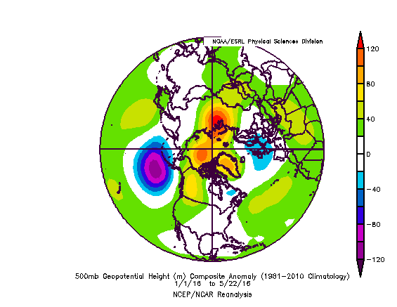 Über der gesamten NH ist starker Hochdruck zu beobachten während sich über weiten Teilen West/Nordwesteuropas Tiefdruck konzentriert. Interessant an dem bisherigen Verlauf seit Januar ist, daß sich das oben abgebildete Druckmuster auch im Frühjahr durchgesetzt hat, hier zum Vergleich der Plot der NH des Frühjahrs