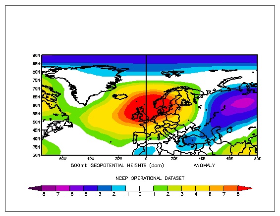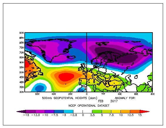 Das Azorenhoch ist - gemessen an der Jahreszeit - schon ungewöhnlich kräftig wenn auch nicht zu stark nach Norden verschoben. Im gesamten Nördlichen Atlantik und der NH hat sich eine kräftige Druckanomalie eingestellt. Diese Konstellation wird wohl für einen recht wechselhaften Frühjahrsbeginn sorgen da es nun Atlantische Tiefdruckgebiete eben leichter haben auf Mitteleuropa überzugreifen. Das wäre die kurzzeitige Rückkehr von Zonalen Wetterlagen, die im Winter kaum aufgetreten sind.