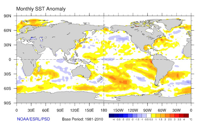 Schaut man sich die Wassertemperaturen bzw. die Abweichungen an so fällt auf daß u.a. Nord-und Ostsee und auch Teile des mittleren Atlantiks ( Azoren ) recht mild sind