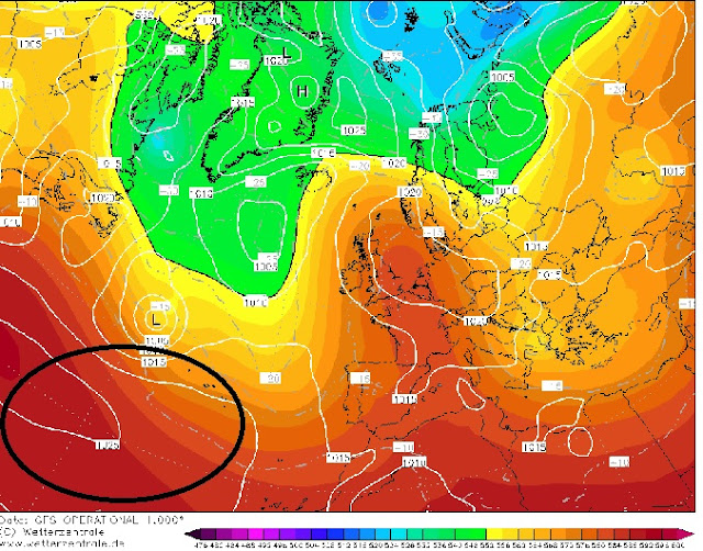 Es hat sich eine mächtige negative Druckanomalie im Bereich Neufundland - Azoren - Irland - Island aufgebaut. Dies hat zu einem deutlich nach Westen verschobenen Azorenhoch geführt