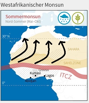 Eine zusätzliche Verstärkung dieses Effekts dürfte der Westafrikanische Monsun verursachen. Wie das? Der westafrikanische Monsun bringt der Sahlezone im Sommer Regen. Die Niederschläge in Westafrika werden durch die Lage der Innertropischen Konvergenzzone (ITCZ) beeinflusst. Sie verschiebt sich halbjährlich und sorgt insbesondere in den Monaten Mai bis Juli für höhere Niederschlagsmengen in Westafrika.