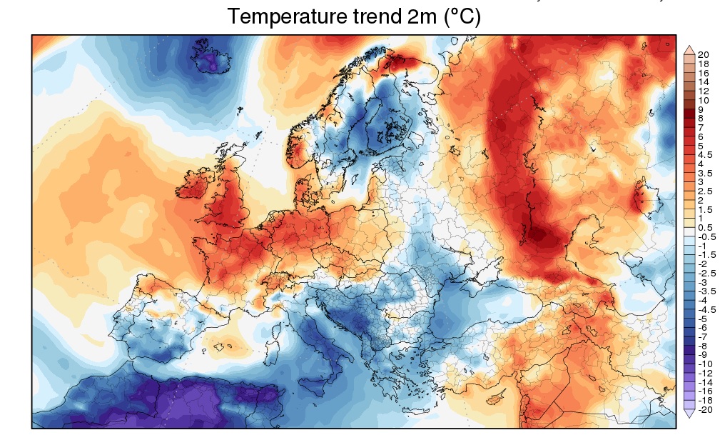 Wie man sieht befindet sich bspw. östlich wenig bis keine Kaltluft. Nördlich gibt es etwas Potential über Finnland und Schweden, aber diese Luftmassen müssten bei entsprechender Großwetterlage über die Nord- und Ostsee, diese sind aber beide, wie weiter oben erwähnt, sehr warm.
