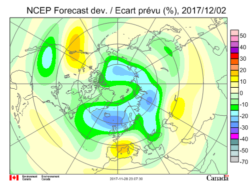 Was aber ebenfalls zu sehen ist : An der Ostküste der USA und Kanada befindet sich relativ wenig Kaltluftpotential. Dieser Umstand sorgt dafür, daß die Tiefdruckproduktion vor Neufundland eher schwach verläuft.