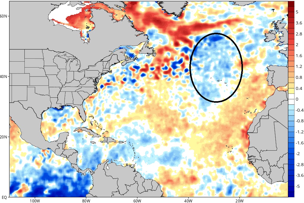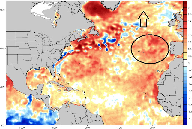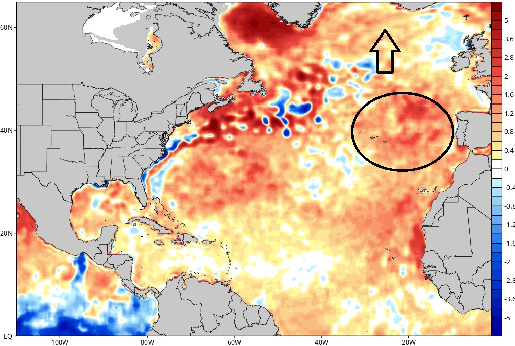 Wie oben erwähnt besteht derzeit sehr hoher Druck über den Azoren, was zu einer Aufsteilung hohen Drucks führte und eine Troglage iniziierte. Verursacht wurde dies durch sehr hohe Abweichungen der sonst üblichen Wassertemperaturen in Verbindung mit hohen Lufttemperaturen. Beides war stark Hochdruck-fördernd.
