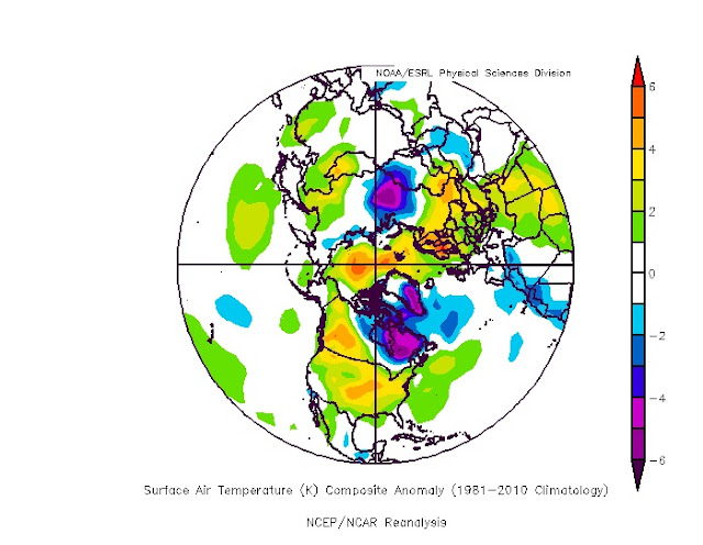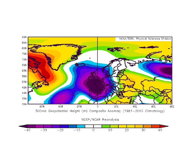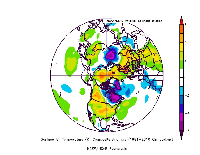Man sieht zwar, daß die Temps über Grönland recht kalt sind, und weiter oben ist zu sehen daß das Wasser ebenfalls zu kalt ist, jedoch kann sich diese kalte Luft nicht dahingehend stabilisieren daß es dadurch zur nachhaltigen Bildung eines starken Grönlandhochs käme, welches im Zusammenspiel mit einem starken Azorenhoch die bereits angesprochenen Nordwestlagen - und damit wechselhaftes, kühles Wetter- verursachen würde.