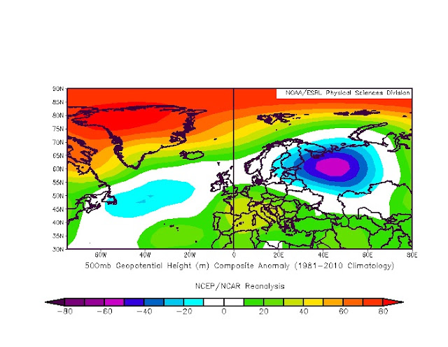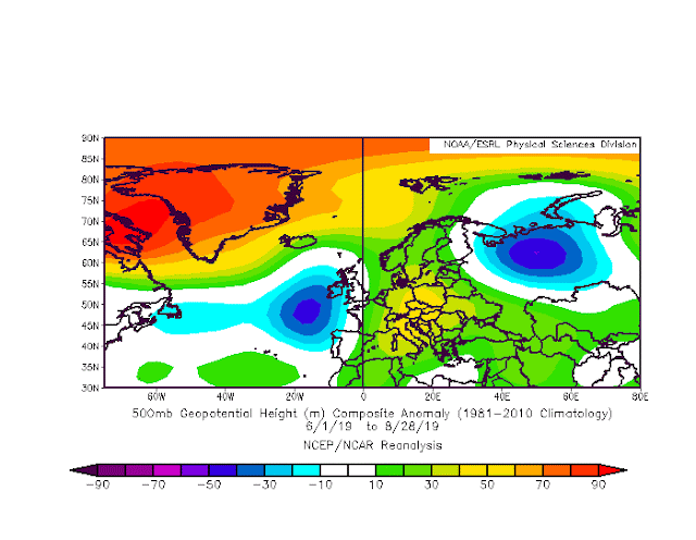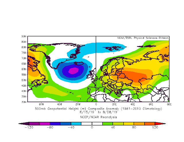 Im Vergleich mit den Wassertemps zu Beginn des Sommers ( siehe meine damalige Prognose ) hat sich das Wasser bspw.nördlich der Azoren bereits deutlich abgekühlt, westlich davon findet man sehr warmes Wasser, noch weiter nördlich ebenso warmes Wasser.  Die Kaltluftausbrüche via NH werden dafür sorgen, daß weitere Kaltluft in den mittleren Atlantik befördert wird ( aufgrund der Drehrichtung der Tiefdruckgebiete links herum ) und das immer noch recht starke Azorenhoch "glätten" werden. Somit wird sich das Azorenhoch nicht aufsteilen und eine Blockade herbei führen können, jedoch ist anzunehmen daß durch das sehr warme Wasser westlich der Azoren das Hoch leicht elipsenförmig wird. Dadurch würde es sich etwas westlich zurückziehen, dürfte aber immer wieder dafür sorgen daß sich ein sog. Azorenhochkeil nach Europa schiebt.