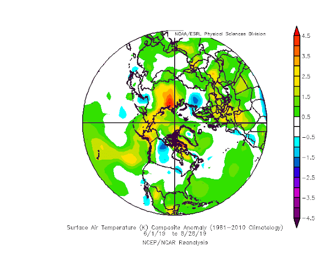 Blicken wir nun auf die Abweichungen der Luft-Temps auf der NH des vergangenen Sommer, man erkennt stärkere positive Abweichungen hauptsächlich zwischen Grönland und Kanada
