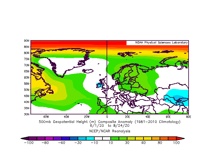Ebenso ist eine starke Tiefdruckanomalie im Bereich Neufundland / Mittlerer Atlantik / Britische Inseln zu erkennen, desweiteren nördlich von Skandinavien und im südöstlichen Bereich von Russland, zonale Lagen dürften sich immer wieder bilden, dazu unten mehr. Bezeichnend dafür der NAO-Index, der in der vergangenen Zeit ( außer Juli und wie erwähnt aktuell ) immer leicht positiv verlief :