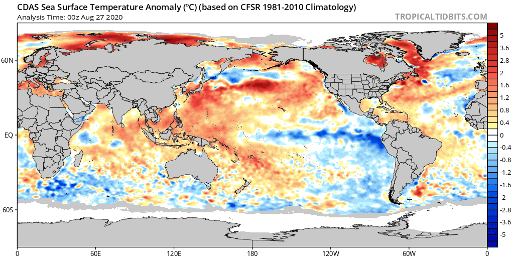 Im Vergleich mit den Wassertemps zu Beginn des Sommers ( siehe meine damalige Prognose ) hat sich das Wasser bspw.nördlich der Azoren nicht sonderlich stark abgekühlt, westlich davon findet man allerdings deutlich wärmeres Wasser, noch weiter nördlich ebenso sehr warmes Wasser welches sich durch die Labradorsee bis in die Davis-Straße zieht. Die Kaltluftausbrüche via NH werden dafür sorgen, daß nun weitere Kaltluft in den mittleren Atlantik befördert wird ( aufgrund der Drehrichtung der Tiefdruckgebiete links herum ) . Da sich aber südlich der Azoren auch sehr warmes Wasser befindet, dürfte sich Hochdruck evtl. etwas mehr nach Süden ausdehnen, eine Südwestliche Strömung wäre zunächst die Folge. Gen Norden wird sich das Azorenhoch nicht aufsteilen und eine Blockade herbei führen können, dies wird durch das kältere Wasser verhindert.