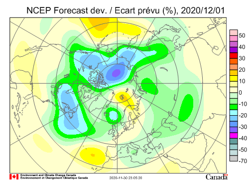 Wie oben bei der Position des Polarwirbel angesprochen ist gut zu erkennen daß sich die Kaltluft zwar zentral über der Arktis platziert hat, sich jedoch weiter nördlich als sonst zurückgezogen hat. Gut zu erkennen ist auch der immer noch leicht blockierte Atlantik.