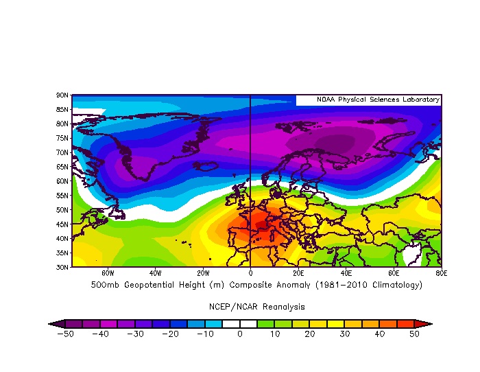 Das zusammentreffen von derzeit warmen Wasser im Grönländisch-Isländisch-Kanadischen Bereich in der Davis-Straße und vor Neufundland mit den aktuell recht kalten Luftmassen polaren Ursprungs sorgt für hohe Gegensätze, daraus resultiert der aktuell hohe NAO-Index. Bei derart großen Gegensätzen, so scheint es zunächst, sollte man annehmen daß es die Westwindzirkulation leicht haben sollte auf längere Dauer Fuß zu fassen, aber : Da sich über der Ostküste der USA viel Warmluft angesammelt hat wird das ausfließen dieser Luftmassen via Davis-Straße bis vor Neufundland stark gehemmt, diese Warmluft ersttreckt sich desweiteren bis in den mittleren Atlantik und sorgte für ein quasi "abriegeln" des Atlantik und so mussten die Tiefdruckgebiete nach Nord und Süd ausweichen, die klassische Westwindzirkulation in Richtung ME ist und bleibt - zunächst - unterbunden.